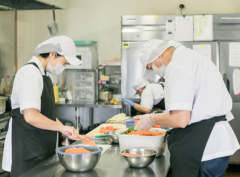 1つ目は給食づくりです。ゆっこらの事業所をご利用される皆様に対して管理栄養士のアドバイスを受けた食事を提供しています。2つ目にブルーベリーの生産販売、3つ目に内職などの軽作業を行い、ご利用の皆様が自分に合った作業を行えるような環境を提供しています。